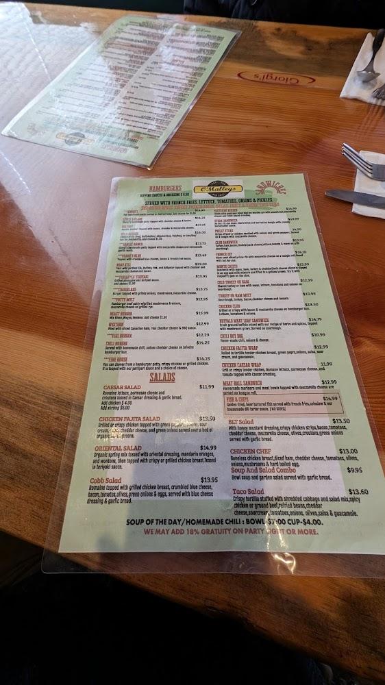 O'Malleys offers an extensive menu that reflects classic pub fare and traditional American cuisine. Guests can choose from burgers, steaks, and comfort foods like chicken fried steak and ribs. Daily specials add a unique twist, ensuring something new to try each visit.
